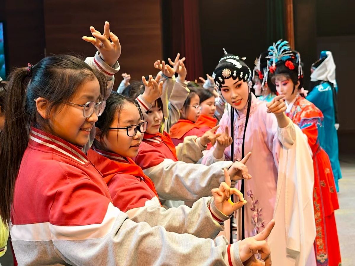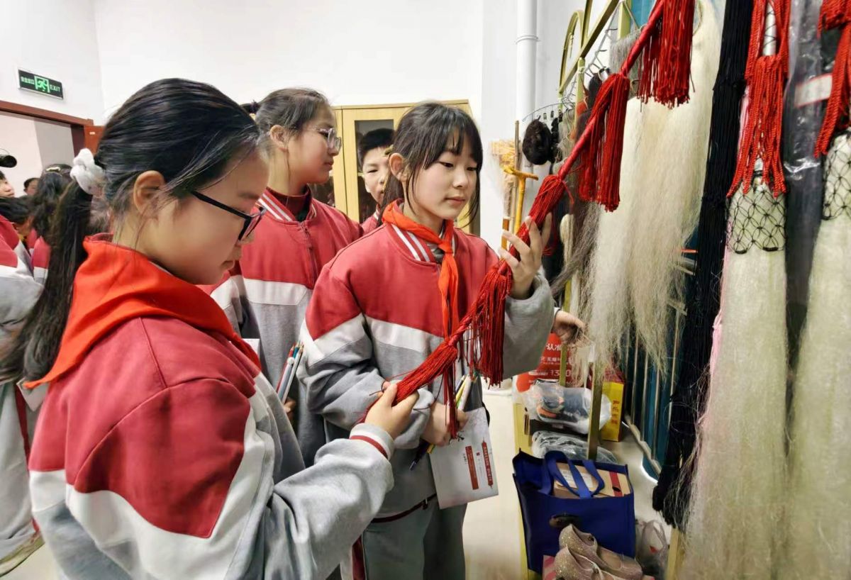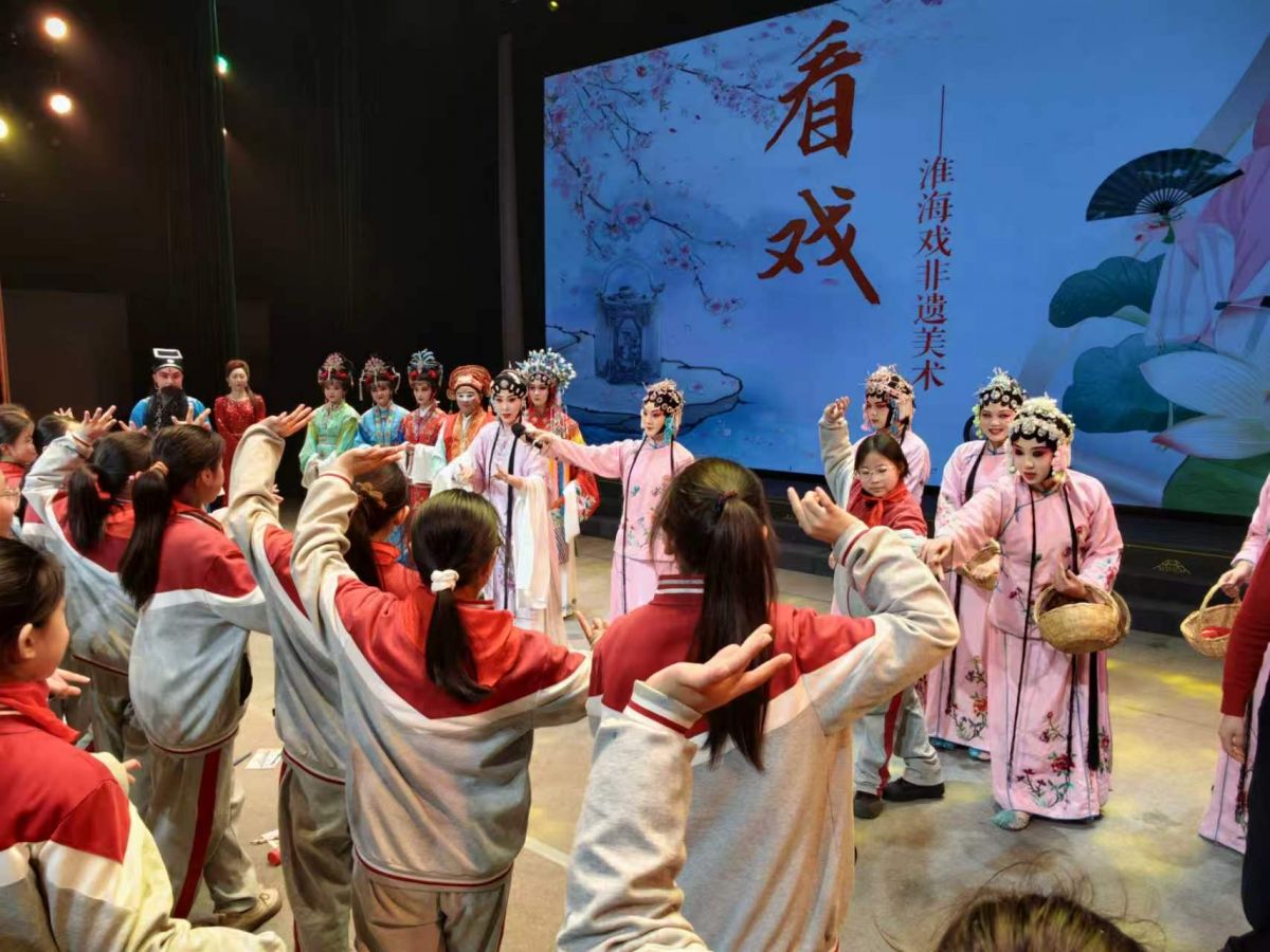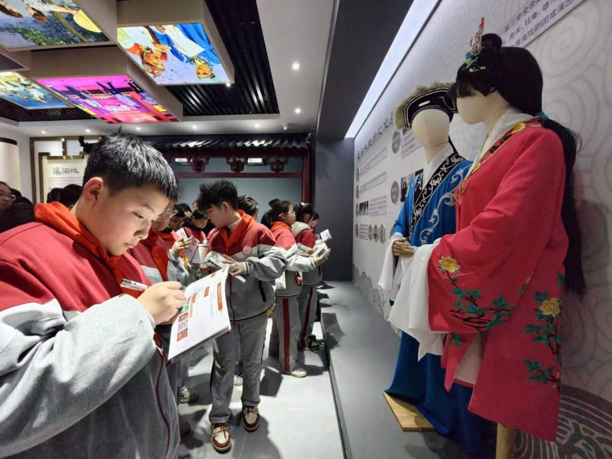 2026年3月11日,江苏省宿迁市沭阳县实验小学的学生来到沭阳县文化馆,通过学习淮海戏知识,参观服饰、道具,与淮海戏演员互动,模仿唱腔、动作等,沉浸式体验淮海戏。丁华明 摄