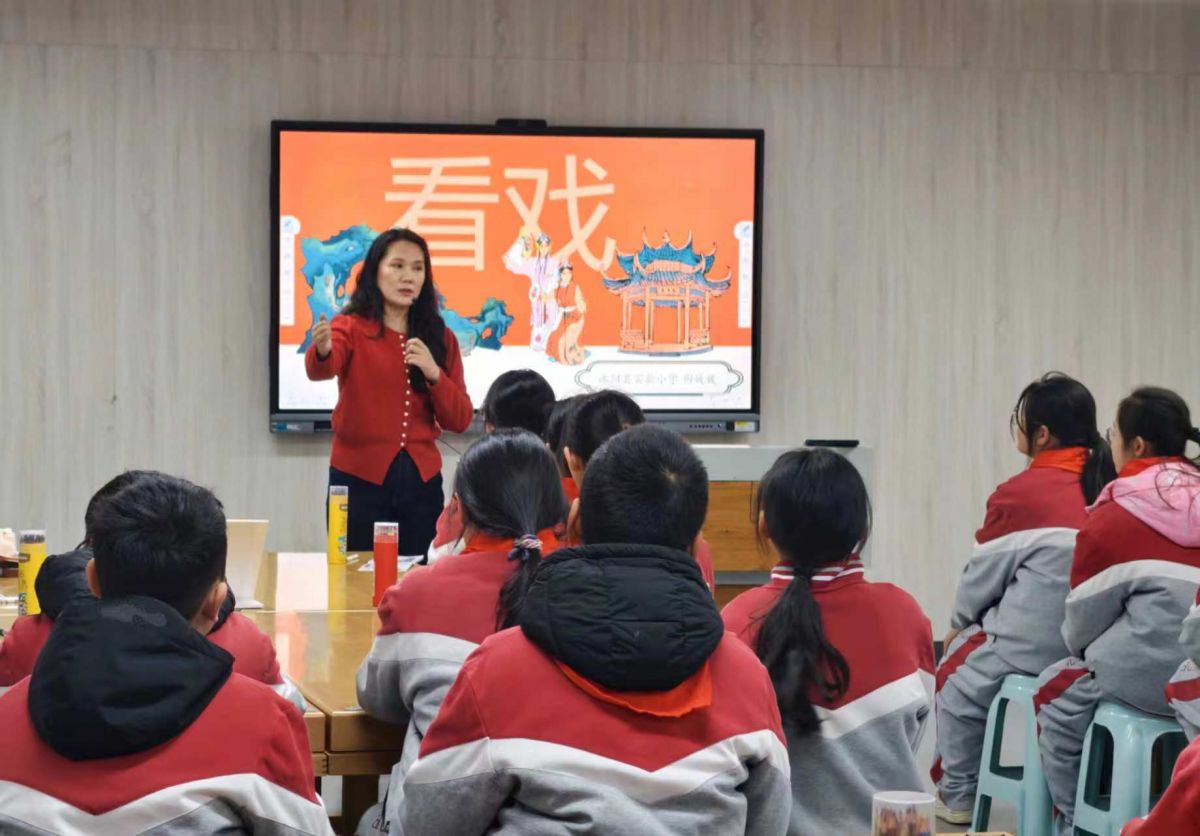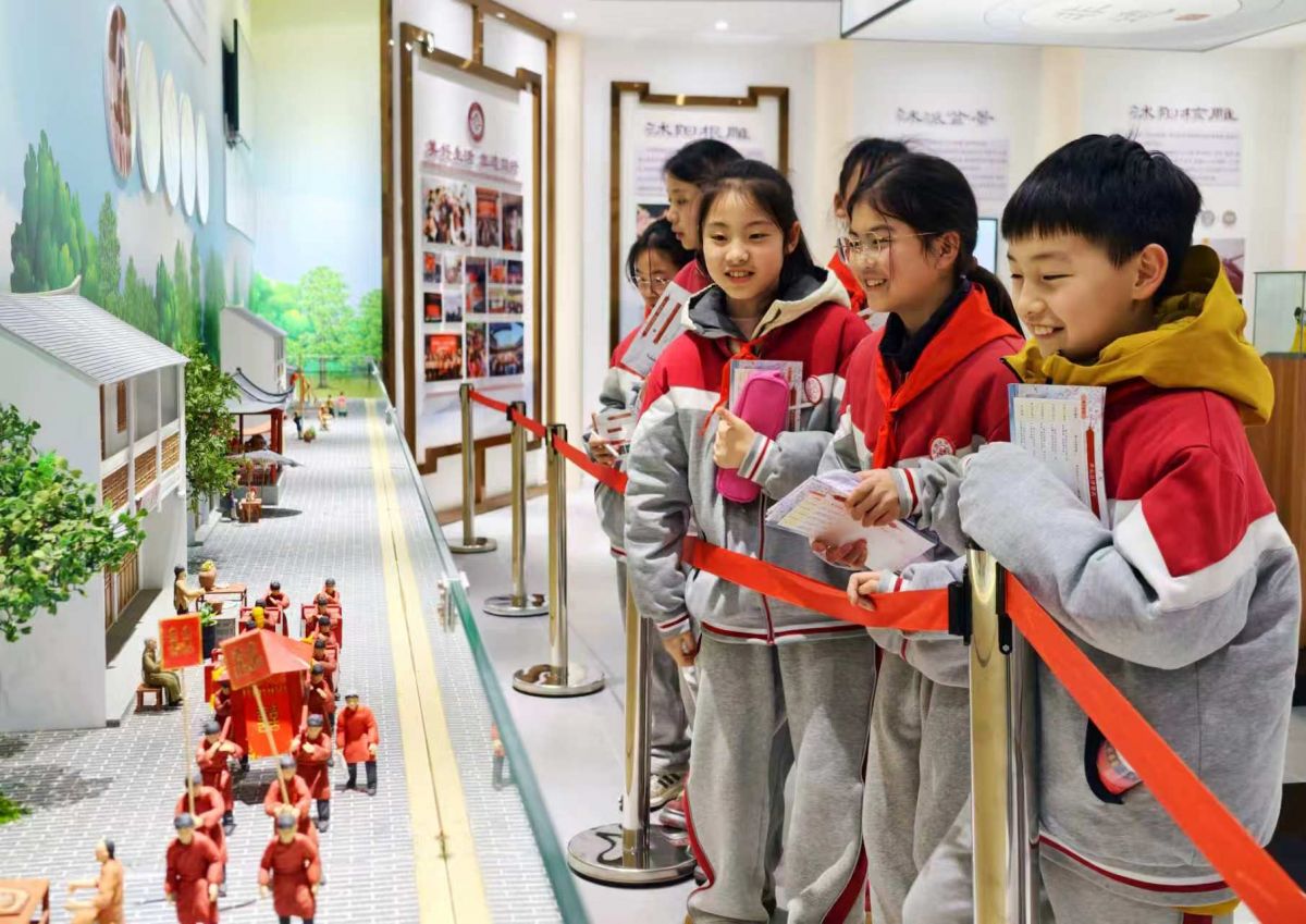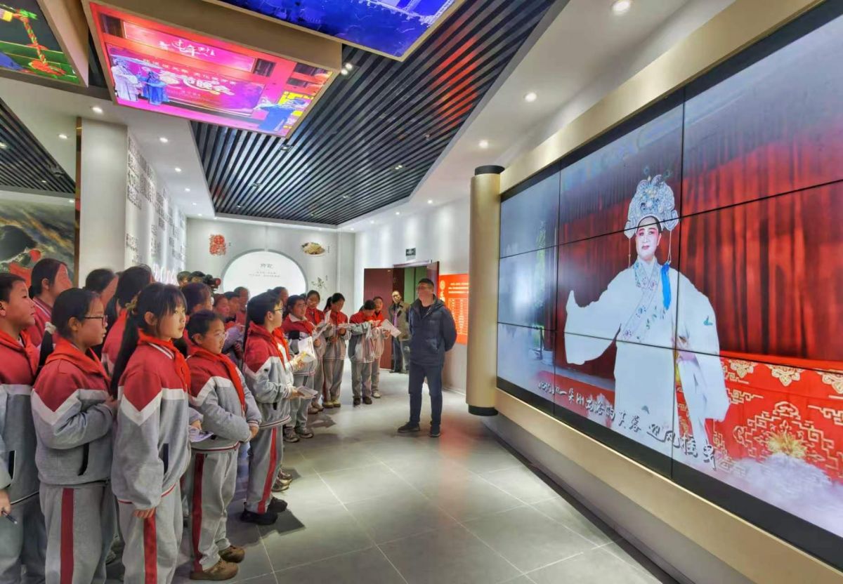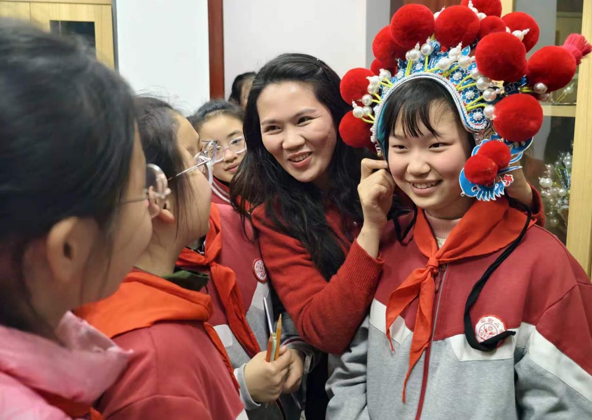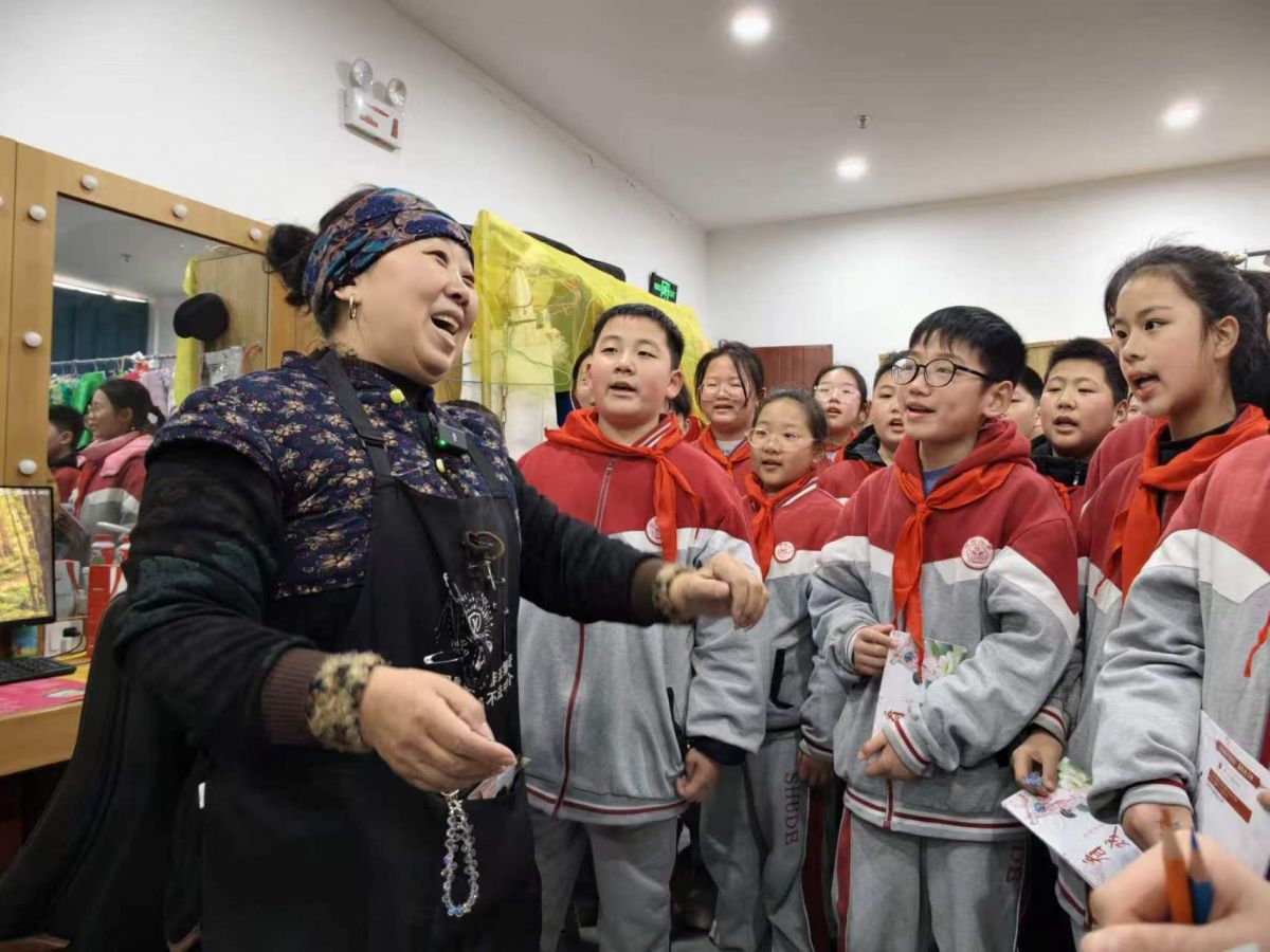 2026年3月11日,江苏省宿迁市沭阳县实验小学的学生来到沭阳县文化馆,通过学习淮海戏知识,参观服饰、道具,与淮海戏演员互动,模仿唱腔、动作等,沉浸式体验淮海戏。丁华明 摄
