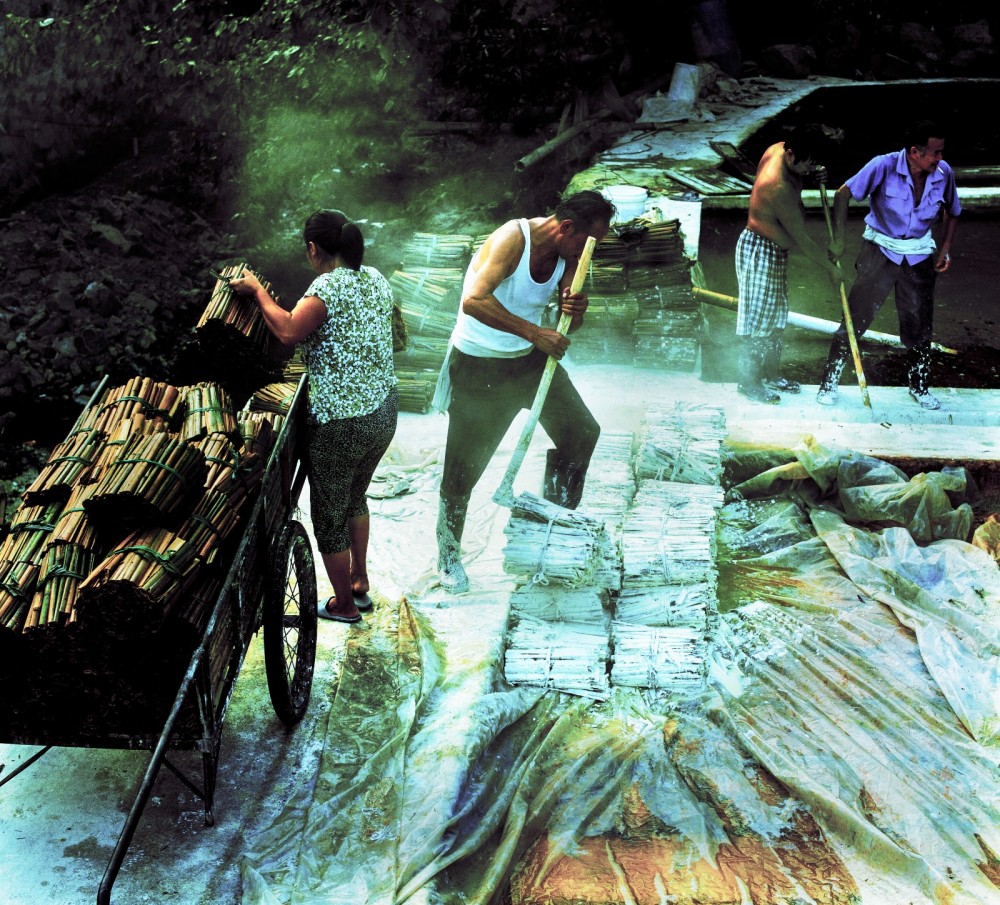 作为一名富阳摄影人,我觉得自己有责任对富阳的“金名片”——元书纸的生产流程一探究竟。2005年春,我决定用相机去挖掘、记录、保存真正意义上的纯手工元书纸生产流程。于是我扛起了哈苏相机,机内压上自喻为“子弹”的TMX120胶卷。花了整整两年的时间,几乎跑遍了富阳大大小小的造纸点(期间还跑进国家级非遗传承人的造纸作坊),结果却没有找到满意的拍摄对象。很多造纸人为了节省成本,提高利润,所用纸浆己经从外地购买或者另辟蹊径,直接釆用化学手段沤制竹料……这一切已经不是原汁原味的手工造纸了。两年下来,我的手工造纸拍摄计划如触冰山一角。徐建华