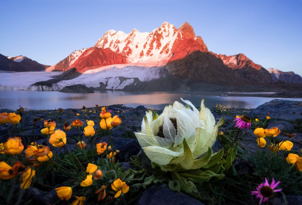 2024年7月24日,新疆,夕照博格达峰。海拔5445米的巍峨山峰耸峙云端,冰湖如剔透翡翠嵌于山间。在海拔4000米乱石嶙峋的严酷环境中,国家级保护植物天山雪莲倔强绽放。