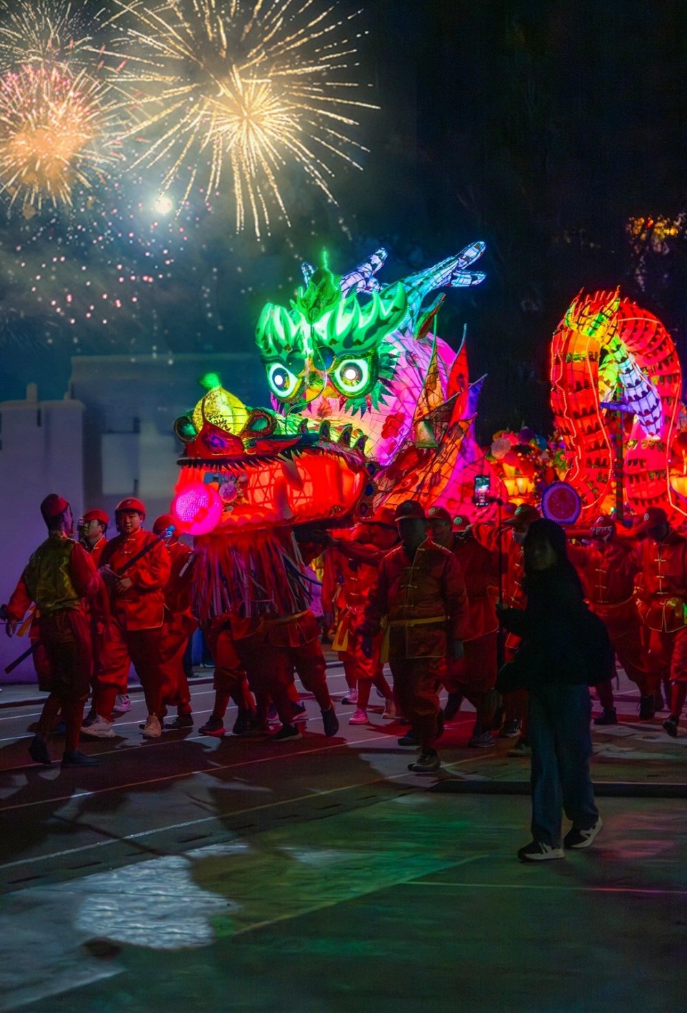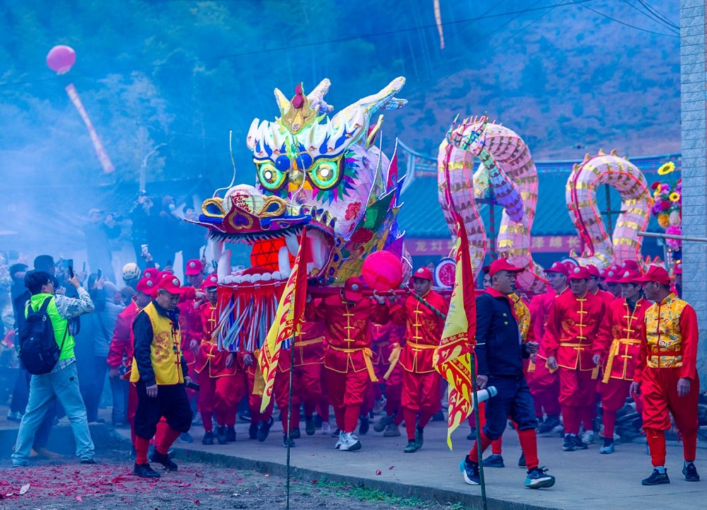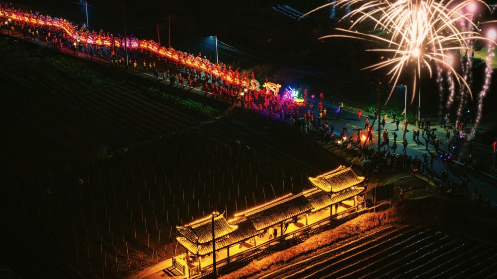 漳平板凳龙的独特韵味,藏在每一处匠心细节里。它以长条板凳为龙骨,镶嵌五彩花灯为龙身,节节相连组成灵动龙形。龙头、龙尾由非遗传承人统一制作,龙身则由各家各户自行装饰,彩花、剪纸、农民画、铃铛等饰品点缀其间,太极、天干地支、二十四节气等中国文化元素暗藏其中,每一节龙身都是村民对美好生活的直白期许。