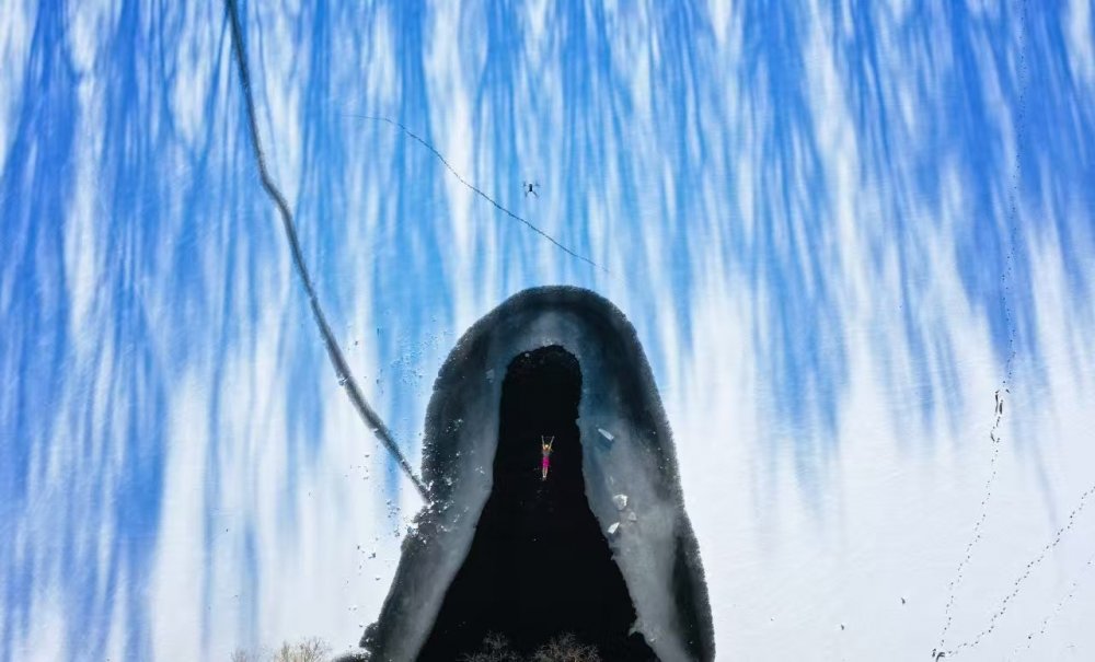 2022年12月3日,雪后的辽宁沈阳北陵公园树影婆娑,冬泳爱好者在水中畅游。