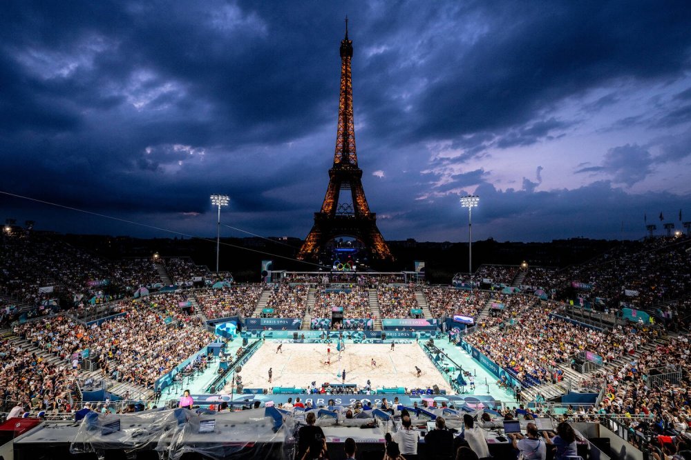 当地时间2024年8月1日,沙滩排球小组赛正在埃菲尔铁塔体育场进行。