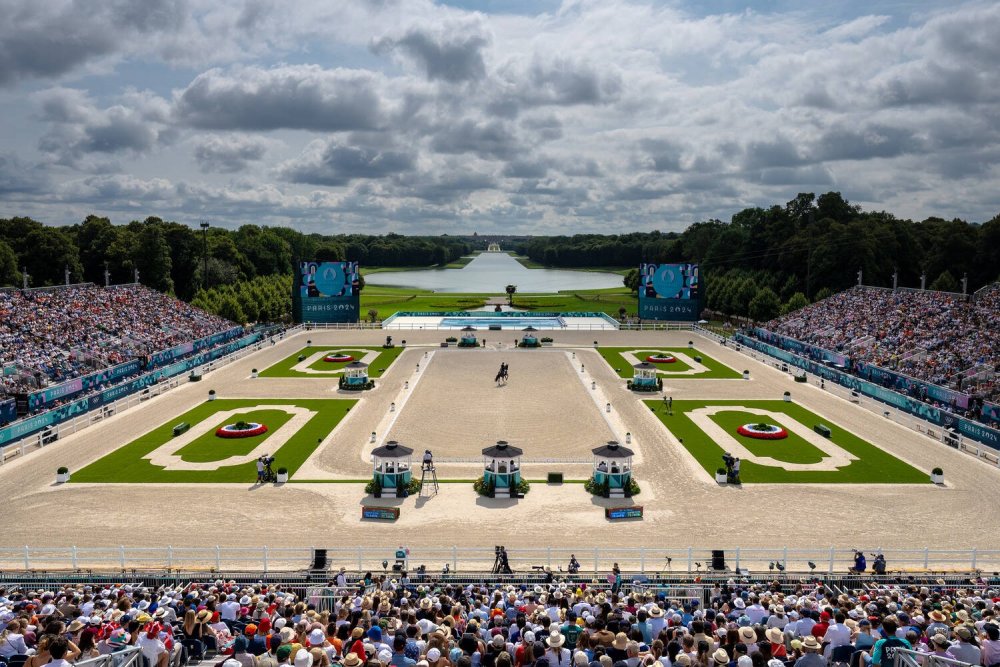 2024年8月3日,巴黎凡尔赛宫,奥运会马术个人盛装舞步音乐自由演绎大奖赛正在进行。
