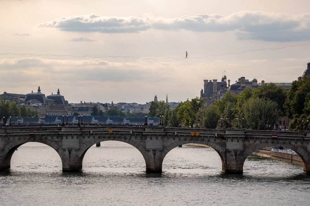 2024年7月24日,一名奥运会开幕式演出人员在横跨塞纳河的新桥上方的钢丝绳上彩排。