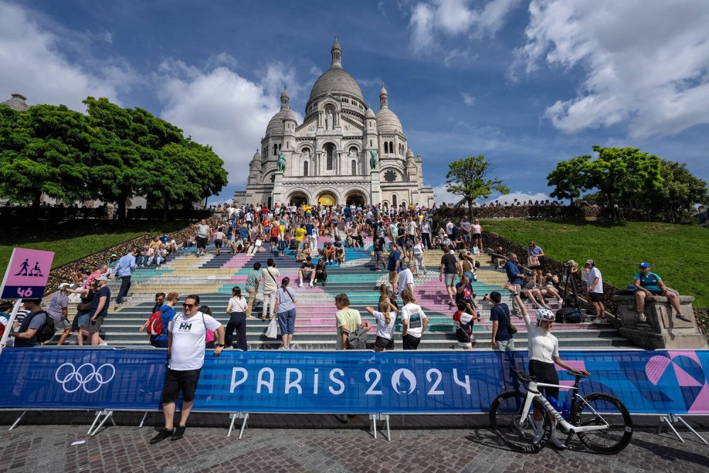 2024年8月4日,巴黎圣心大教堂,观众坐在台阶上,等待奥运会公路自行车比赛开赛。
