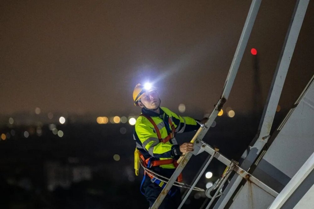 徐学昕顶着大风,戴着头灯,拿着工具,认真检查钢梁、螺栓安全,不放过任何隐患。