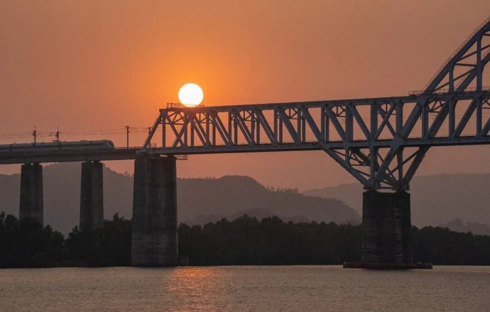 一列高铁迎着朝阳驶过榕江特大桥。
