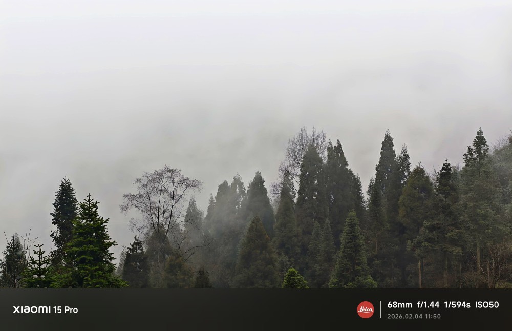 这是一次毫无准备的即兴拍摄。清晨推开家门,眼前的山林已被一层薄雾温柔笼罩。深浅不一的绿色在雾中晕染开来,仿佛一幅天然的水墨画。我立刻拿起手机,想把这份静谧又朦胧的美留住。