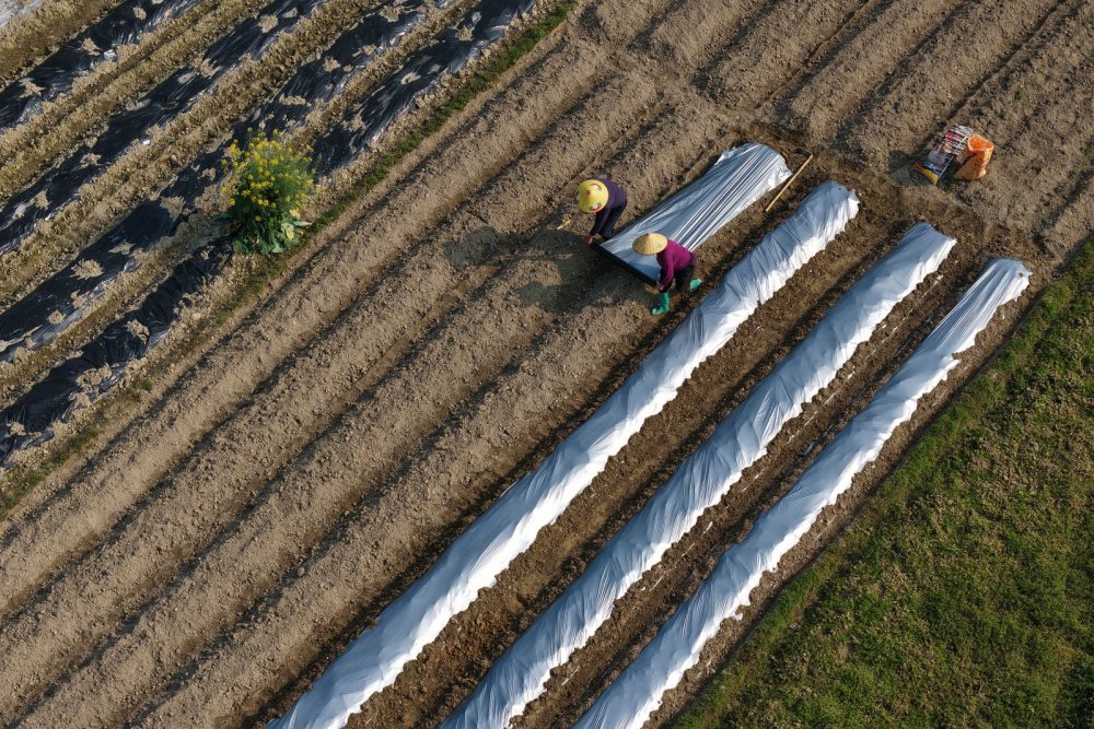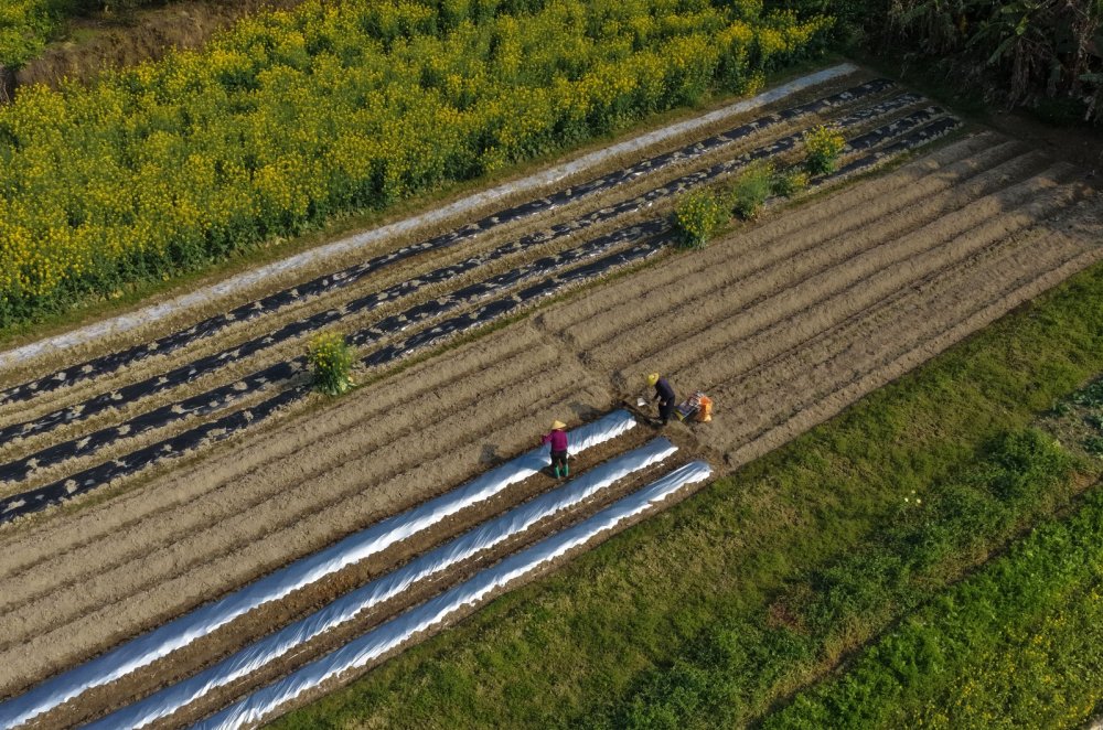2026年3月6日,广西壮族自治区融水苗族自治县融水镇新国村,村民在田间开沟盖地膜,为春耕春种做准备。龙林智 摄