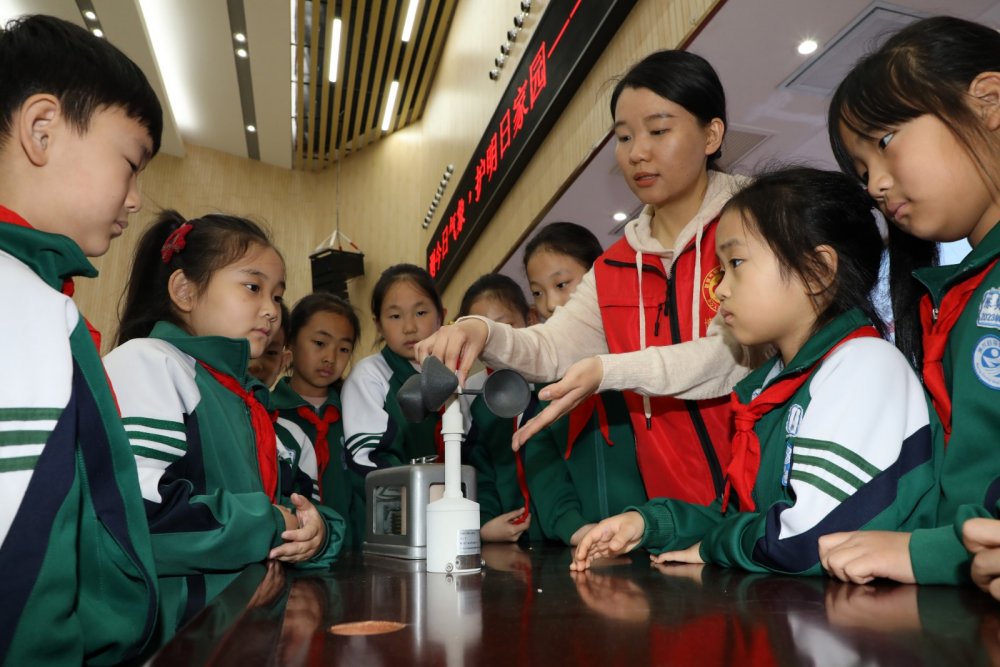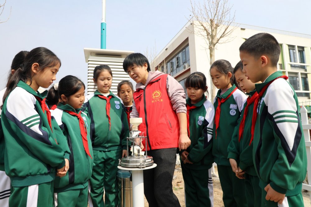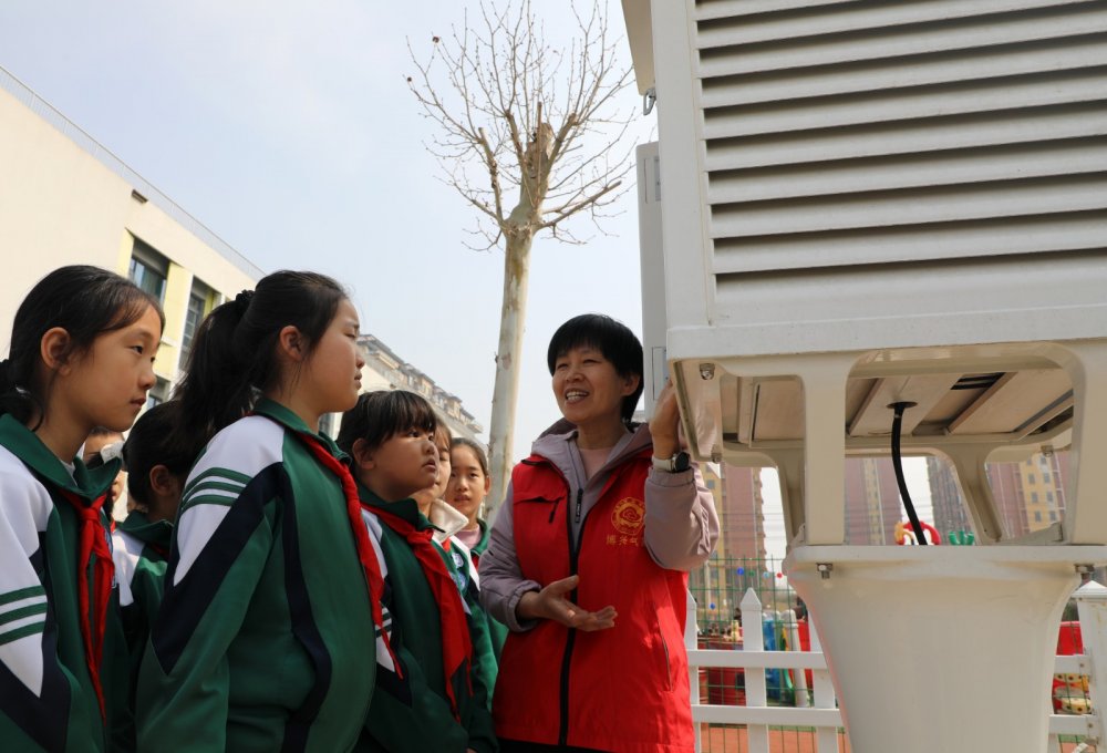 2026年3月23日,在山东省滨州市博兴县第四小学,博兴县气象局志愿者在指导小学生学习气象知识。