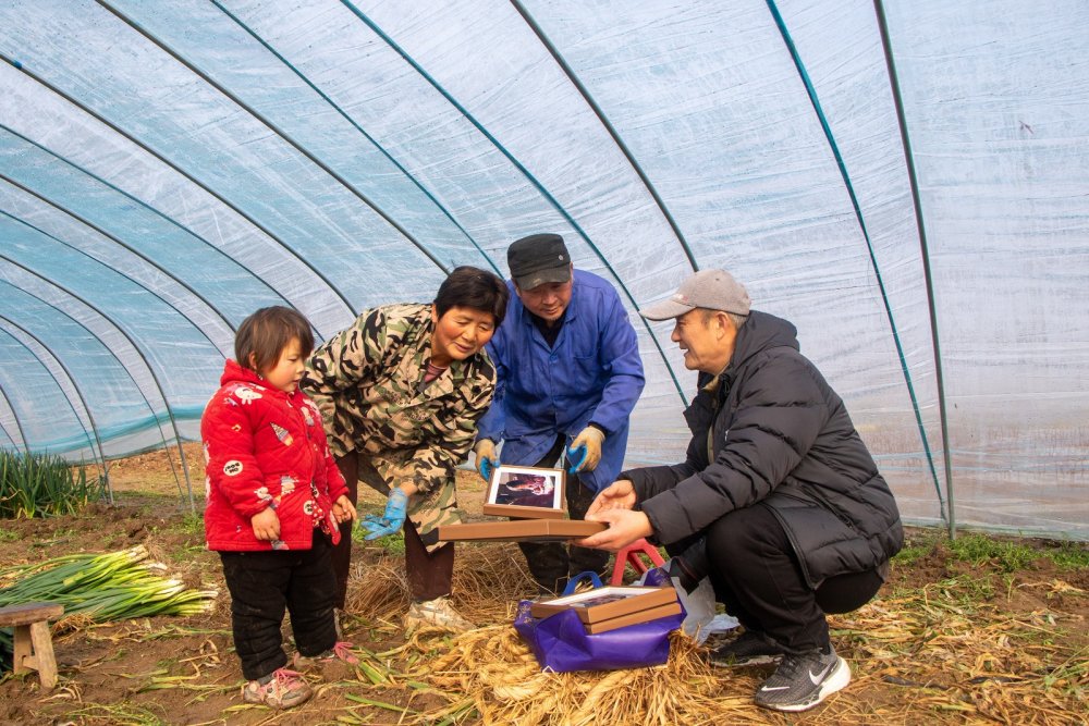 2月1日,安徽省阜南县摄影家协会组织志愿者深入乡村开展 “新春福照送农家”公益拍摄活动,免费为乡亲们拍摄“全家福”、个人照。图为摄影志愿者把制作好的照片送到正在蔬菜大棚里劳作的村民手中。杜平 闫保彬 供图