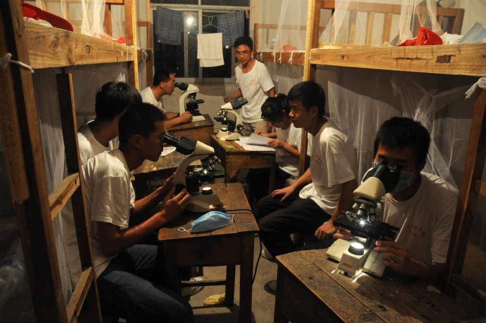 2011年7月2日夜里,安徽医科大学暑期“三下乡”的同学们在寝室里,用显微镜查看经过清洗的粪便是否含有虫卵。
