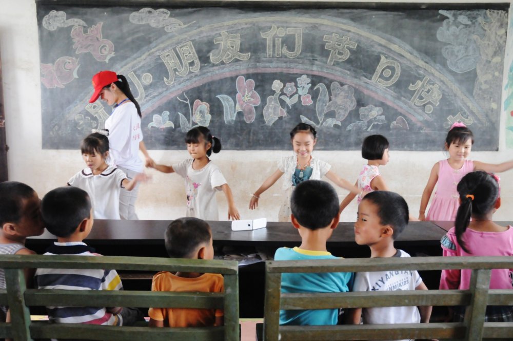 2011年7月16日,大学生带着留守儿童唱歌、跳舞。