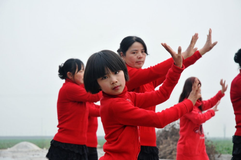 2013年1月31日,村内农业综合开发项目堆放材料留下的水泥空地,成为村民集体活动的好地方,女士、孩子们穿上统一的服装跳起广场舞。