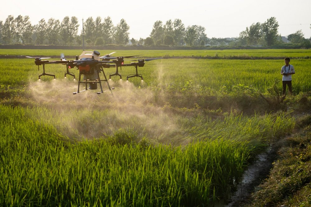 2020年7月22日,农技人员使用无人机给村里的水稻田打农药。