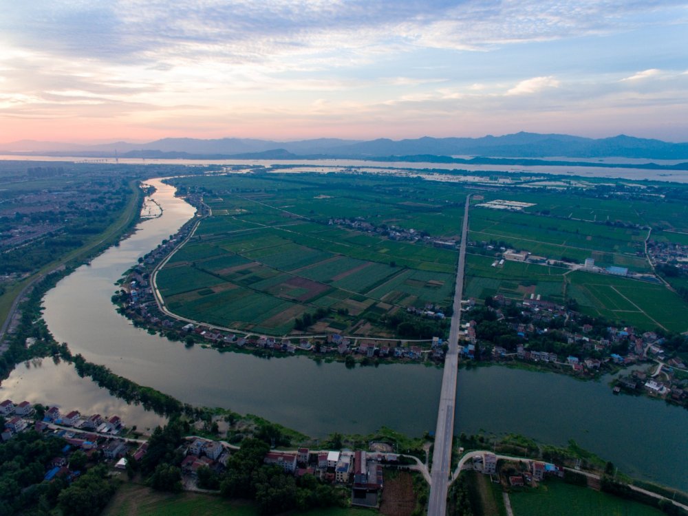 2020年7月23日,朝阳下的计渡村。华阳河沿着村子蜿蜒流入不远处的长江。今年暴雨袭击的长江干流安徽段全线超警戒水位28天,险情不断,但是计渡村及周边良好的农田水利设施保住了村里的水稻等农作物。