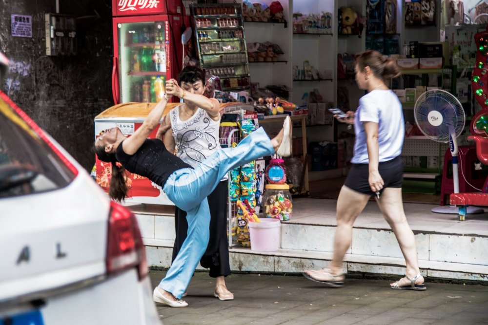 2019年7月20日,四川宜宾市翠屏区李庄镇。两位喜欢跳舞的女士,在自己家商店门前跳起了国标探戈。