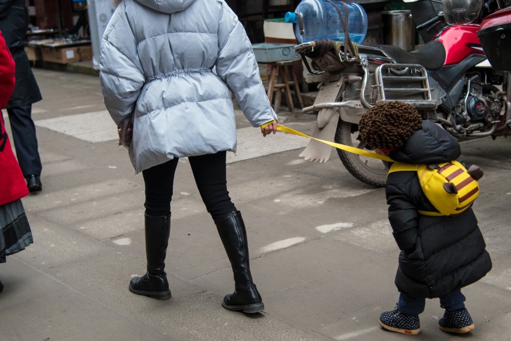 2020年12月18日,四川自贡市大安区牛佛镇。一位女士“牵着”小孩赶集。