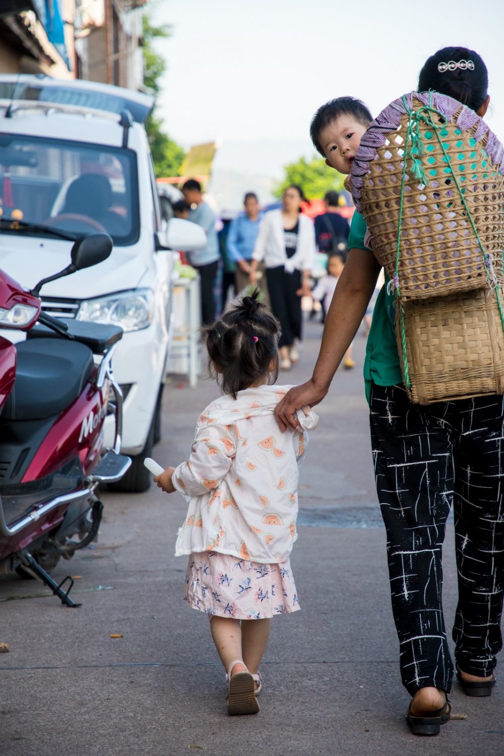 2020年5月18日,四川宜宾市叙州区喜捷镇。一位村民背着孙子、牵着孙女赶集。