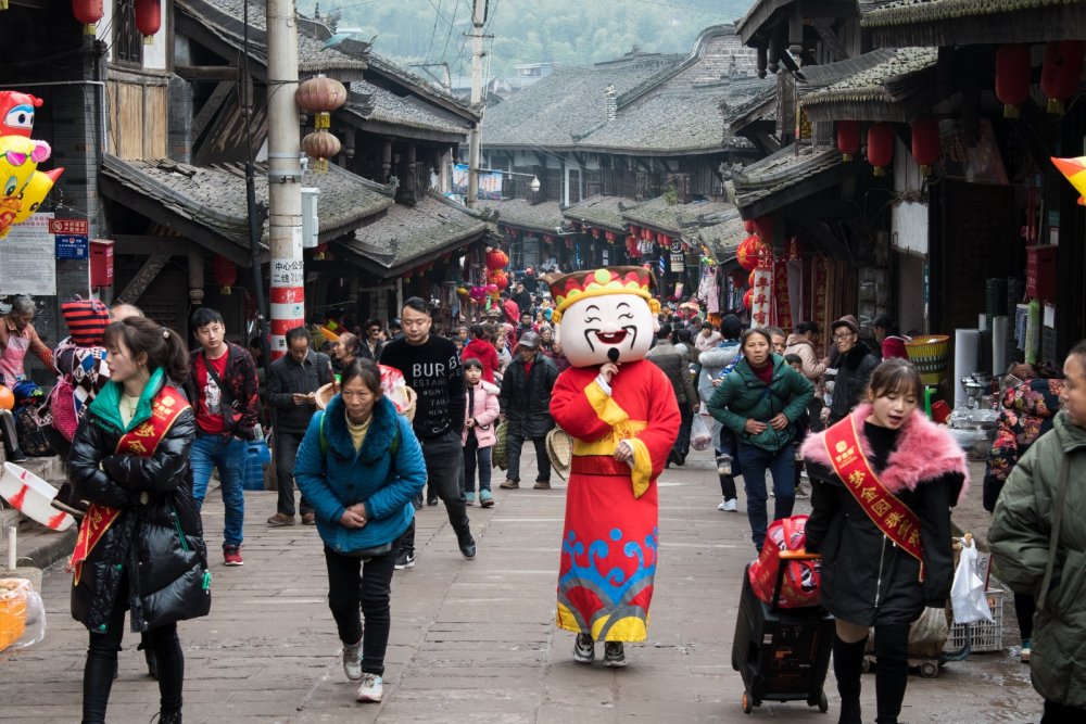 2020年1月6日,四川宜宾市叙州区横江镇。临近春节,赶集置办年货的老乡比平日多了不少,商家也不失时机变着花样宣传自家商品。