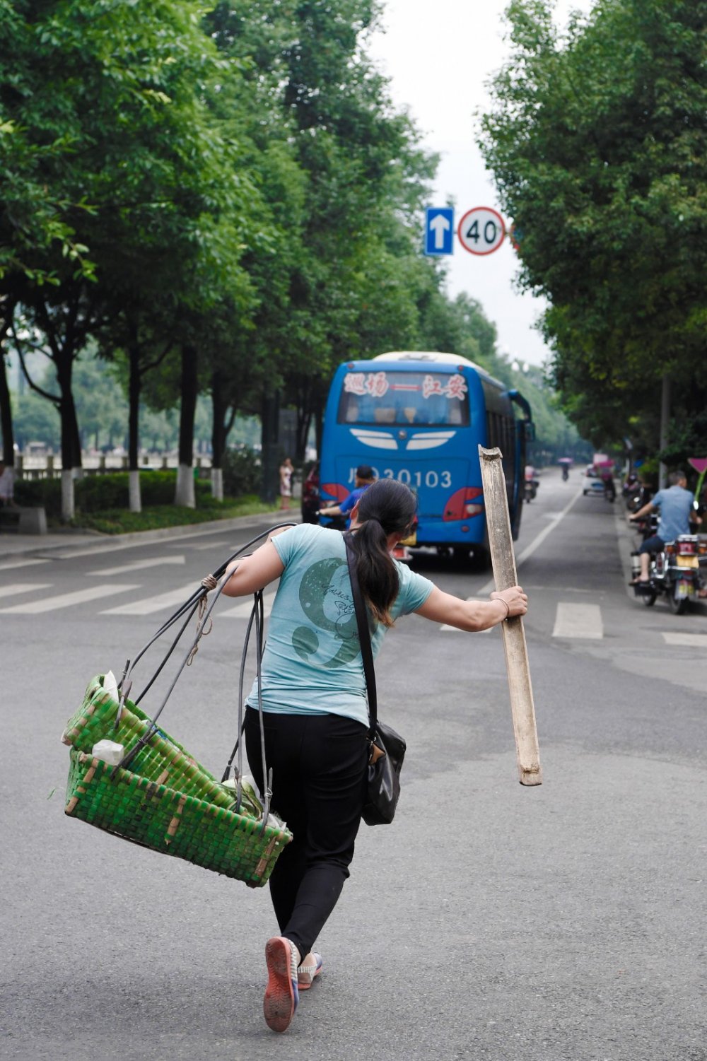 2018年6月24日,四川珙县巡场镇。集市散场,一位村民拎着竹挑子追赶班车。