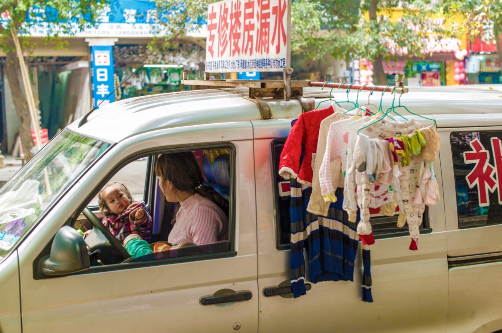 2016年3月20日,四川宜宾市翠屏区李庄镇。流动的“家”,一位年轻妈妈带着孩子在车里休息。