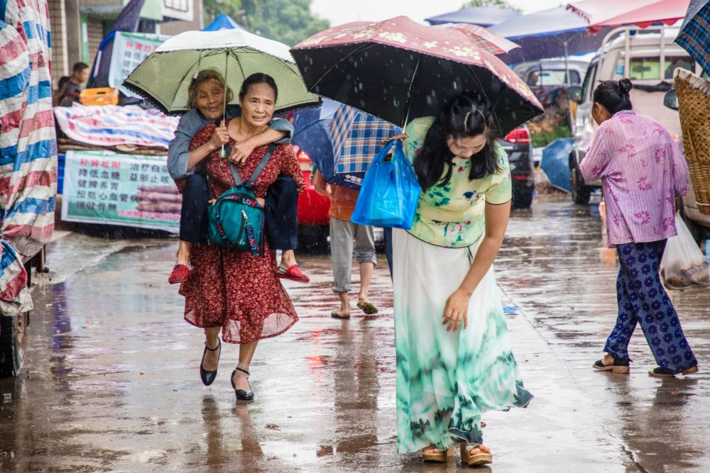2019年9月8日,四川宜宾市叙州区喜捷镇。雨天,赶完场的村民背着老人回家。
