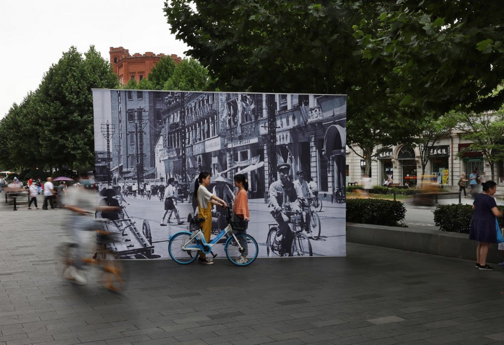 2021年6月18日,武汉市中山大道, “五十年代中山大道街景”图片闪现街头,两名中学生推着共享单车与当年骑车的年轻人同框。
