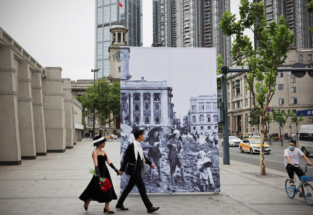 2021年6月18日,武汉市江汉关,一对拿着玫瑰花的年轻人从“1954年长江大洪水,市民筑堤防汛”的老照片前携手走过。