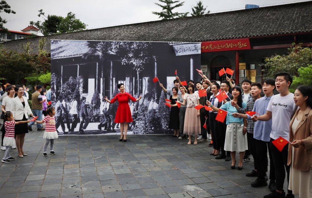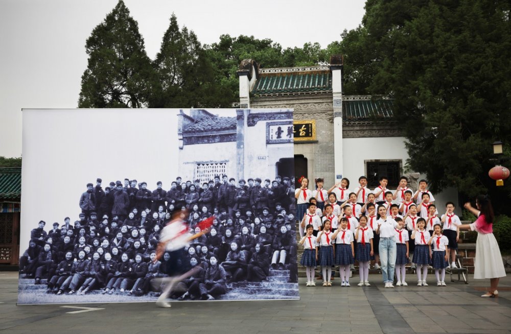 2021年6月19日,武昌中央农民运动讲习所旧址,一幅“六十年代学生参观农讲所”的老照片前,歌剧《洪湖赤卫队》第五代韩英的扮演者杨娟(中),与武汉音乐学院学生、“赓续奋斗血脉,百名追梦人重走红色足迹”队员和参观者同唱《唱支山歌给党听》。