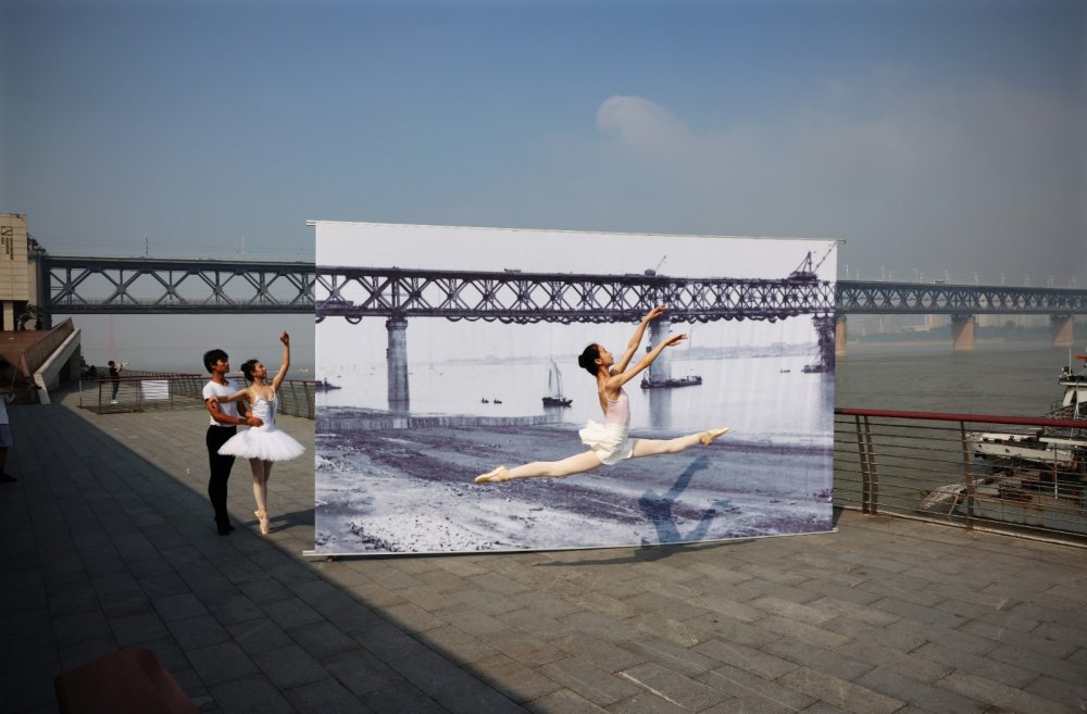 2021年6月22日早晨,武汉长江大桥观景平台,一曲《唱支山歌给党听》的旋律响起,武汉市艺术学校的学生在“1956年长江大桥修建场景”照片前翩翩起舞。