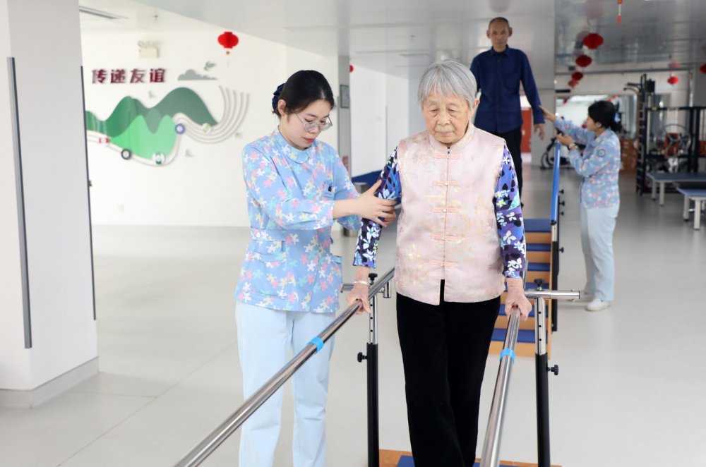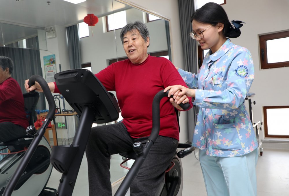近年来,山东省滨州市博兴县按照老年群体就医养老核心需求,以医养融合发展为核心抓手,持续完善全链条医养结合服务体系,深化服务供给,推动惠民政策精准落地,同时创新融合模式,紧扣“医院+养老”融合主线,推动基层医疗机构与养老机构深度合作,为失能半失能等重点人群提供“医疗+照护”无缝衔接服务,实现全流程常态化监管,全力保障医养服务规范、安全、高质量运行。图为2026年3月25日,在山东省滨州市博兴县中医医院杏林养护院,入住老人在照护人员指导下进行训练。陈彬 摄