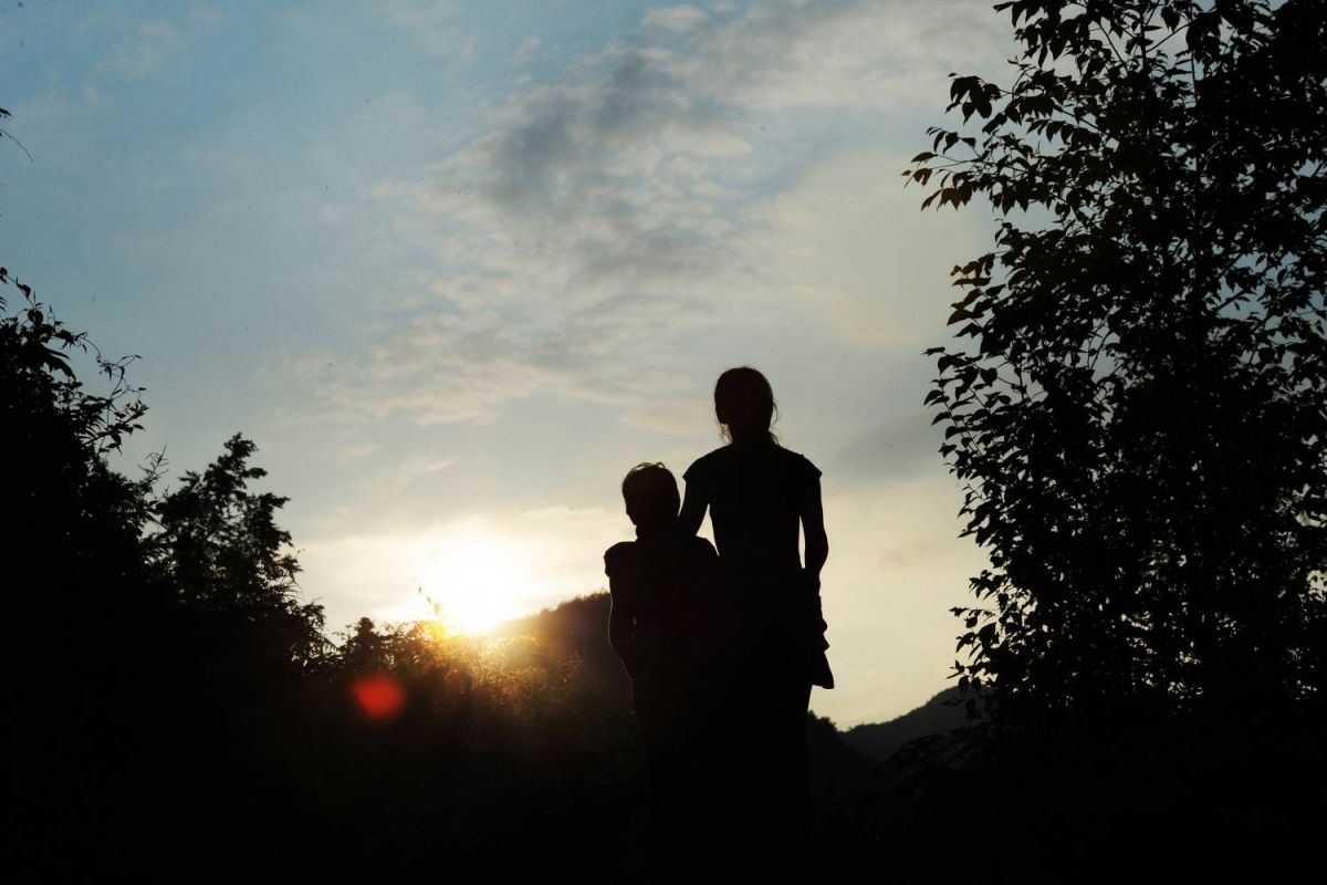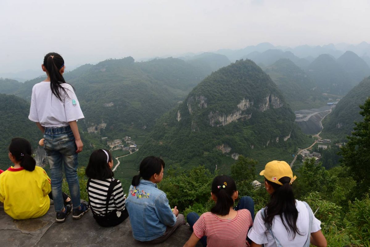 2019 年 7 月 4 日,贵州省毕节市大方县狗吊岩村,孩子们爬上山顶眺望远方。