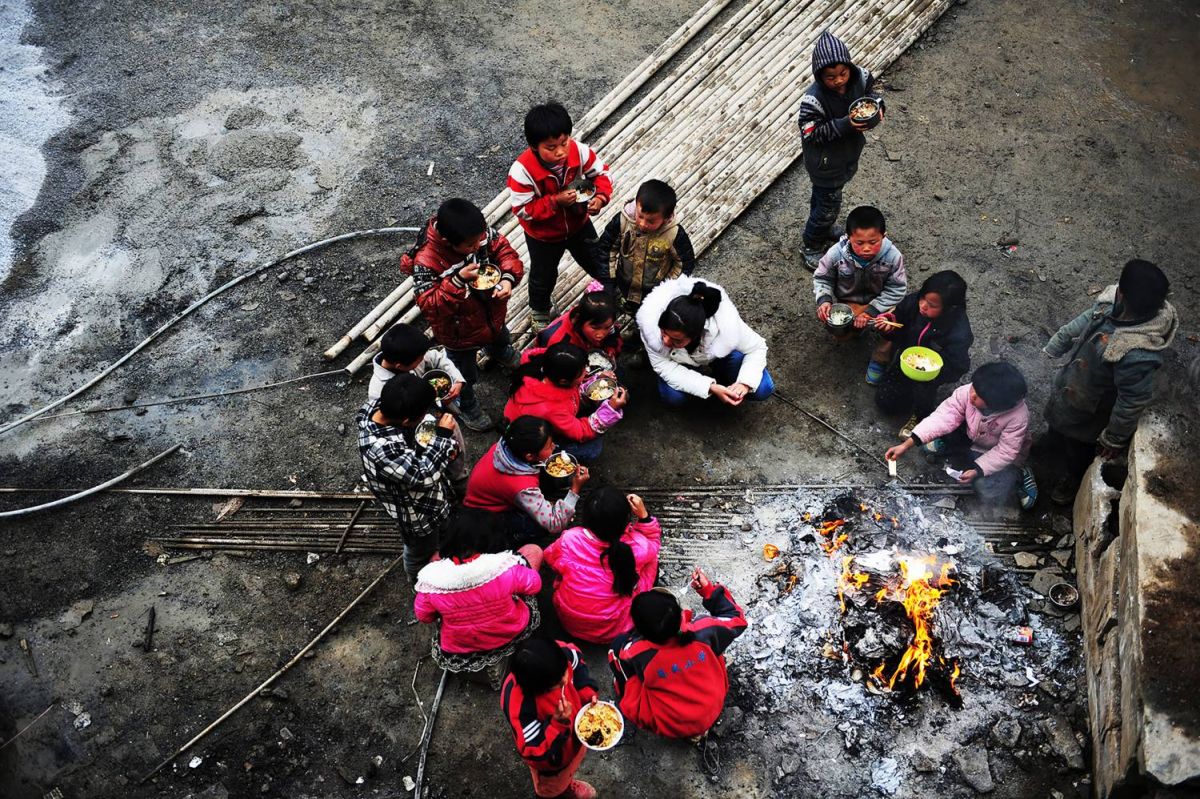 2015 年 3 月 11 日,贵州省毕节市大方县狗吊岩村为民希望小学操场上,康胜美(中)给吃午饭的孩子们生火取暖。康胜美是徐本禹教出来的第一个大学生,2014 年在武汉念完大学后返乡支教。