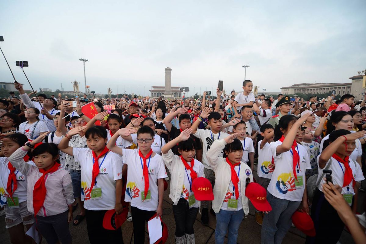 2019 年 7 月 30 日,北京市,来自贵州为民希望小学、大石希望小学、箐山本禹希望小学和湖北建始摩峰希望小学的优秀学生代表,在华农大研究生支教团志愿者带领下观看升国旗。