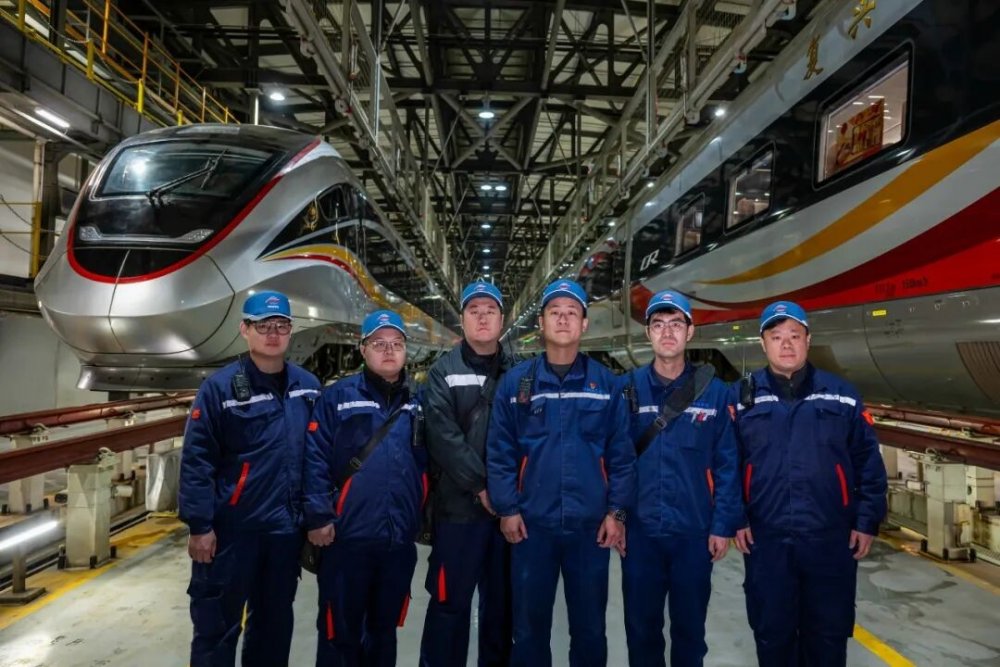 耿嵩程和CRH3A-A动车组检修小组的成员在一起。